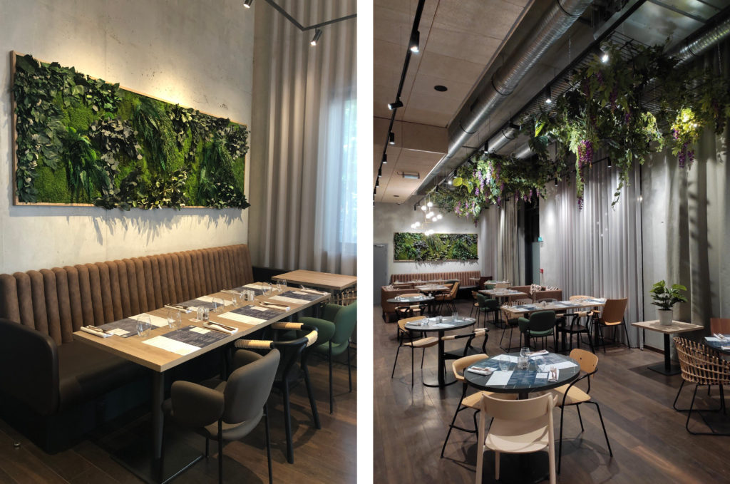 Nous avons végétalisé la salle de restaurant du Novotel Annemasse pour apporter de la chaleur à un espace design contemporain.