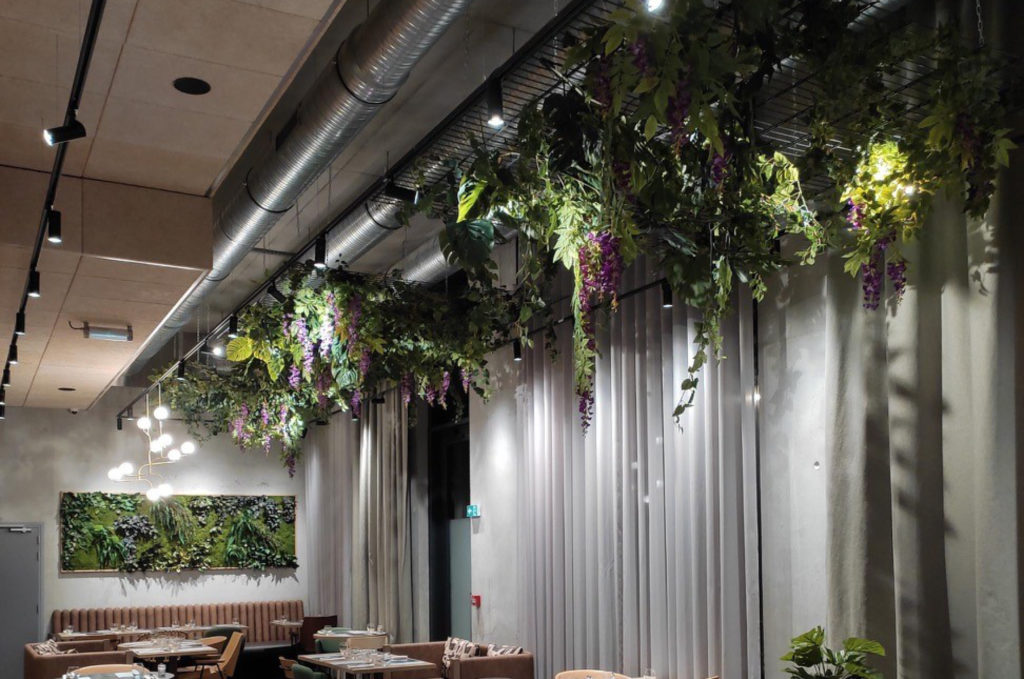 De la conception à la réalisation, nous avons accompagné notre client dans son souhait de modernité avec un plafond végétalisé et des tableaux végétaux qui se marient parfaitement avec le décor de la salle.