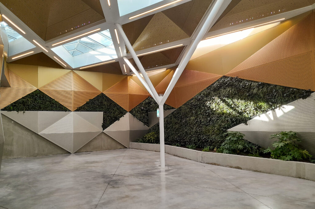 En lien avec le cabinet Architectures CS, nous avons réalisé des murs végétalisés aux formes complexes, intégrés dans l'habillage en métal de la façade de l'extension (orfèvrerie végétale).
