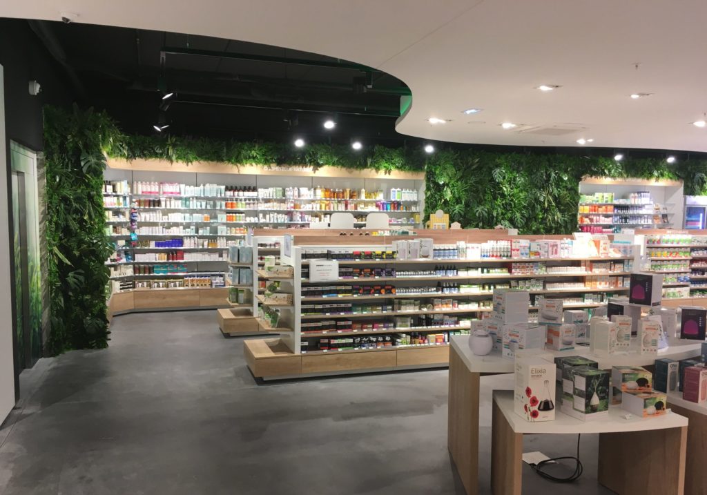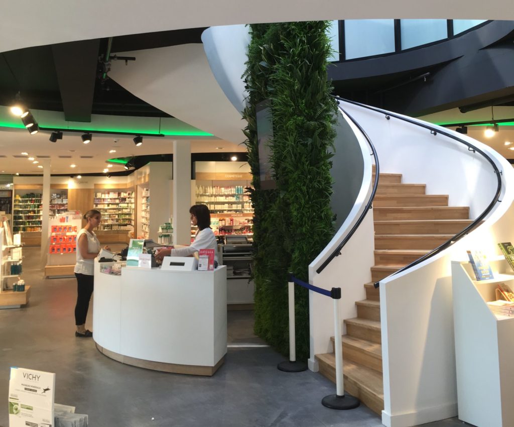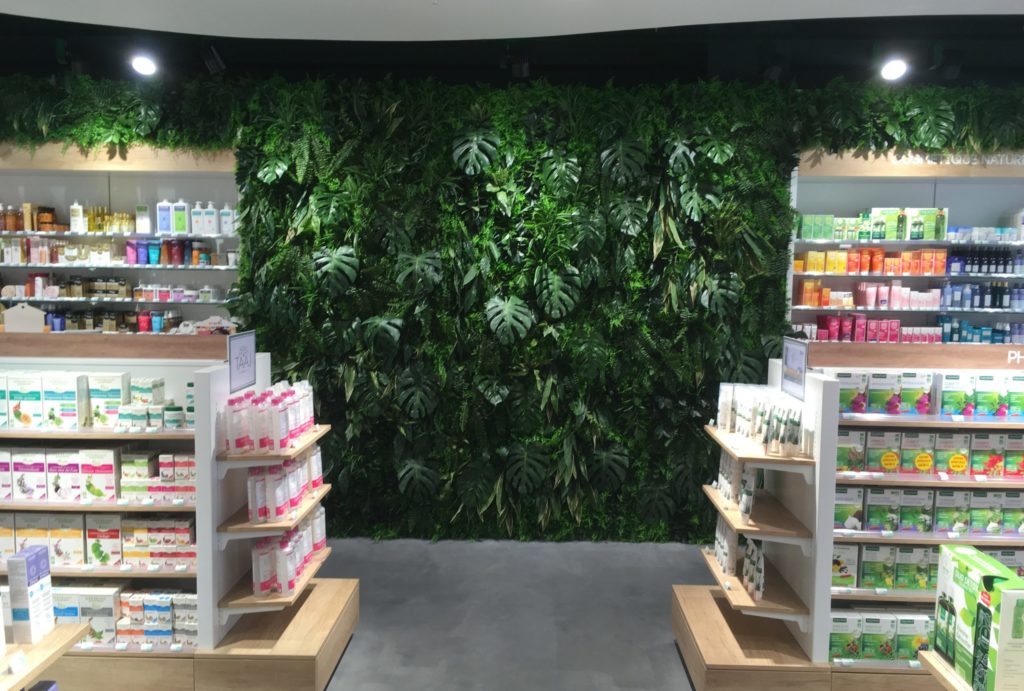 Espace pharmacie : habillage des linéaires, mur végétal intérieur en plantes artificielles 17 m².