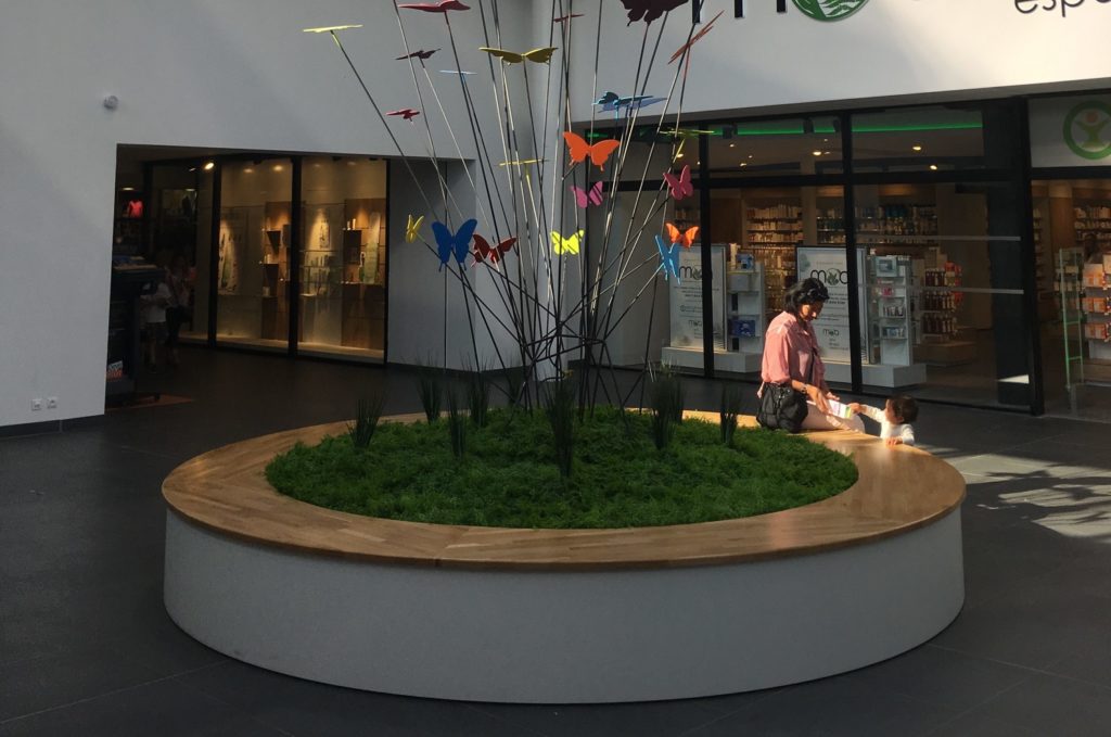 Galerie : grande jardinière circulaire de 3 m de diamètre, colline de gazon et plantes artificielles de 7 m² décorée de papillons en métal.