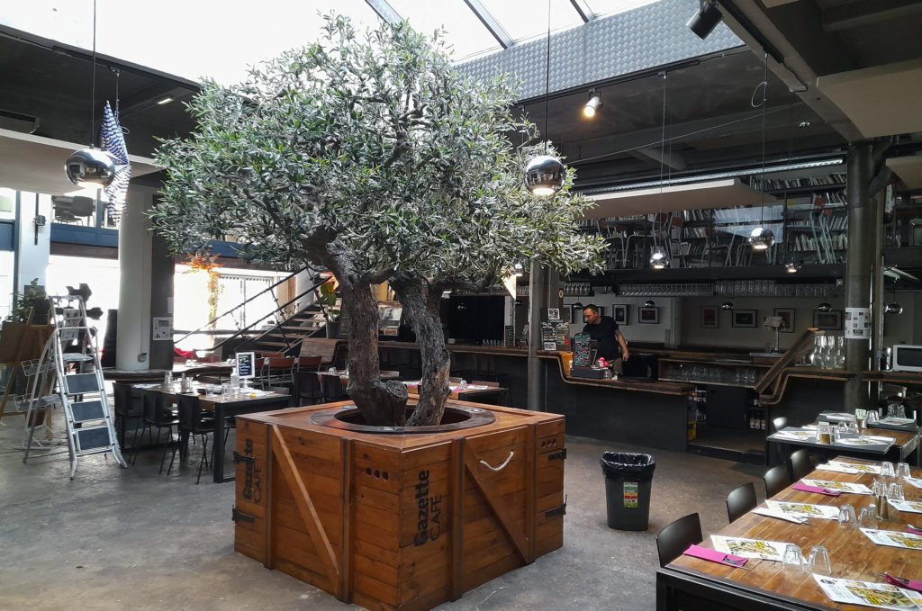 Nous avons installé un grand olivier reconstitué sur tronc centenaire au restaurant Gazette Café à Montpellier.