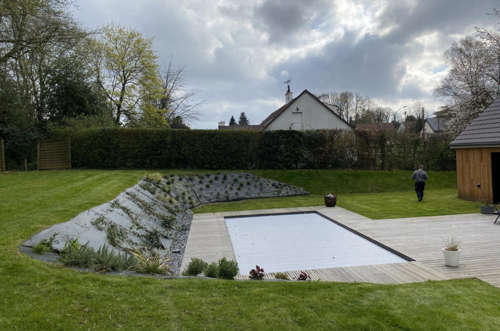 Nous avons aménagé le jardin d'un client particulier à Bois Guillaume. Le chantier a débuté en 2021 et les dernières finitions de gazon ont été effectuées en avril 2022 :