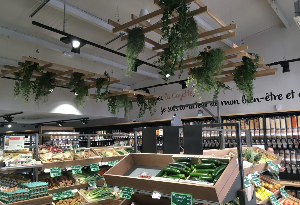 Nous avons créé et installé des décors en bois et des végétaux suspendus dans les rayons du magasin bio La Cagette Des Gones à Lyon.