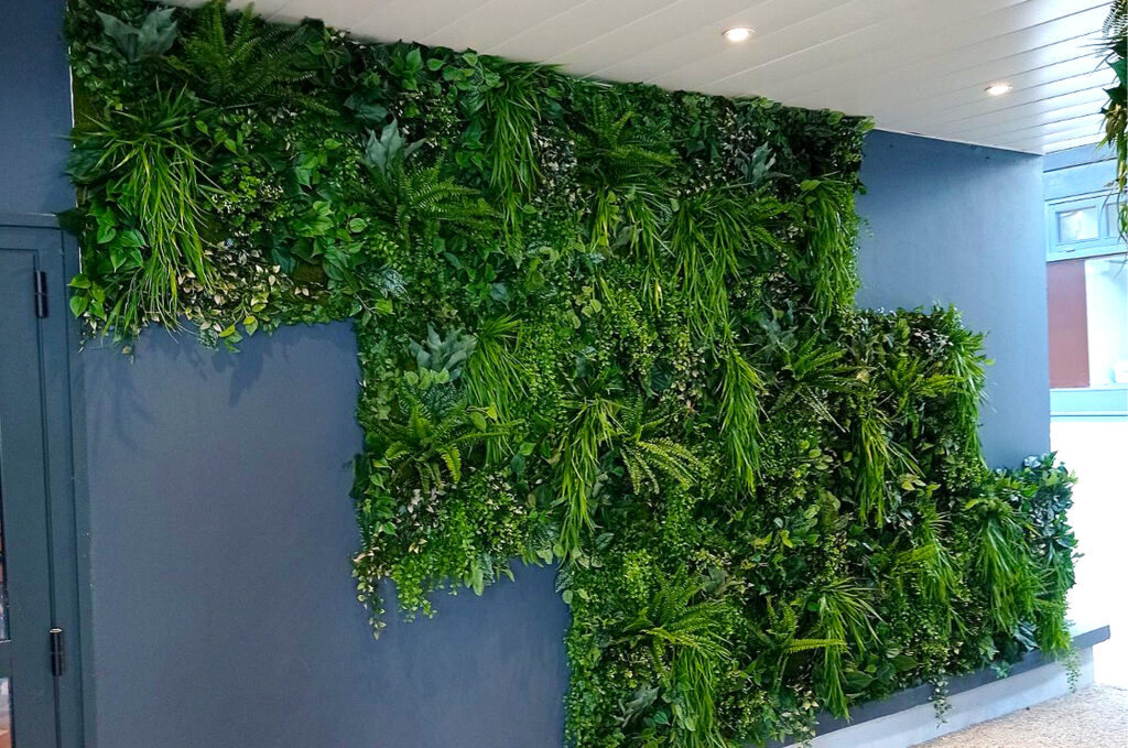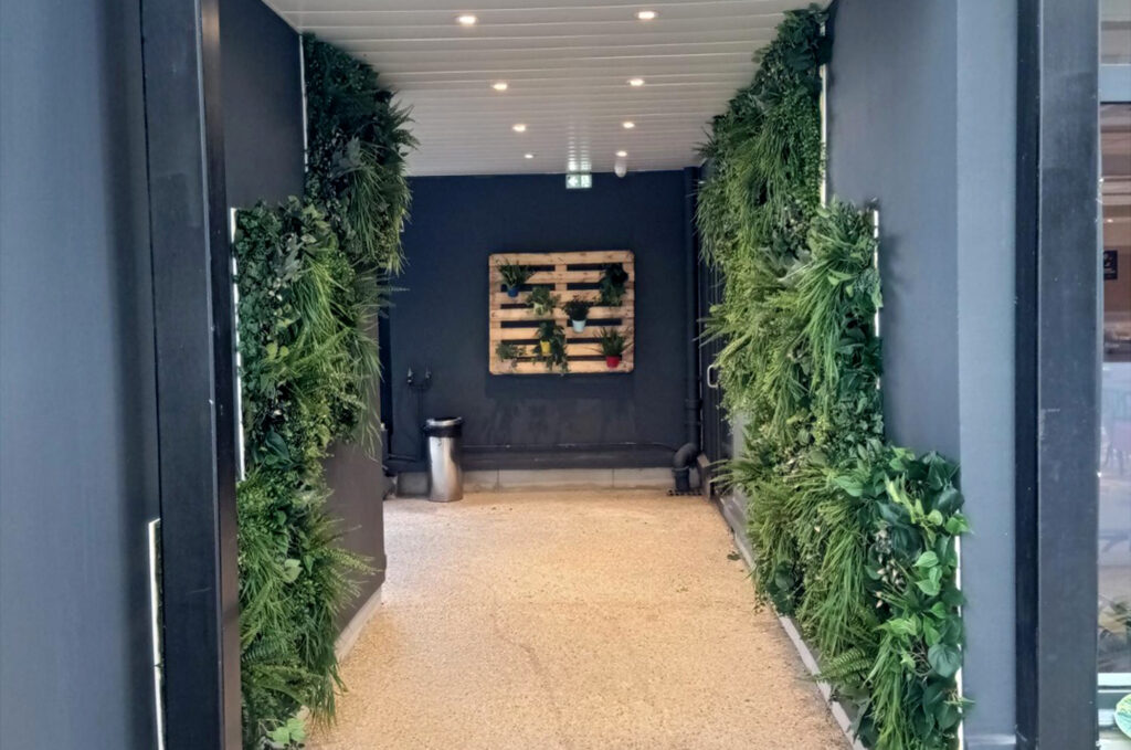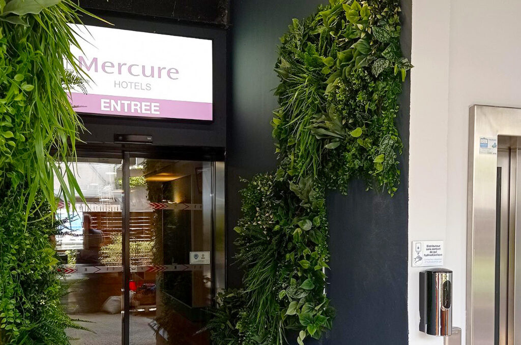 Nous avons végétalisé l'hôtel Mercure/Ibis de Paris Porte d'Orléans avec des plantes grimpantes et odorantes dans des jardinières existantes à l’entrée du parking et végétalisé l'entrée de l'hôtel avec des bandeaux de végétaux artificiels.
