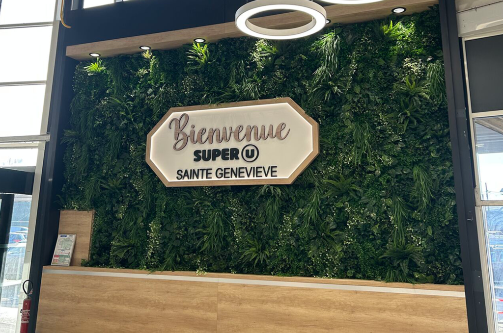 Installation d'un mur végétal artificiel dans une réservation incurvée du hall du Super U Sainte-Geneviève.