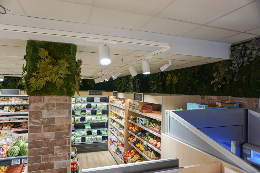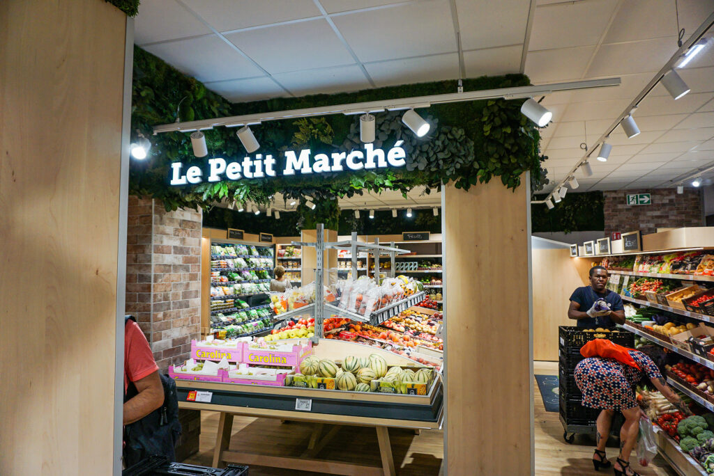 Nous avons adapté le décor en fonction des espaces et ainsi installé le mur en bandeau au-dessus des rayons, en haut des colonnes, sur les poutres, sur le bandeau lumineux « Le Petit Marché », et à l’arrière des caisses.